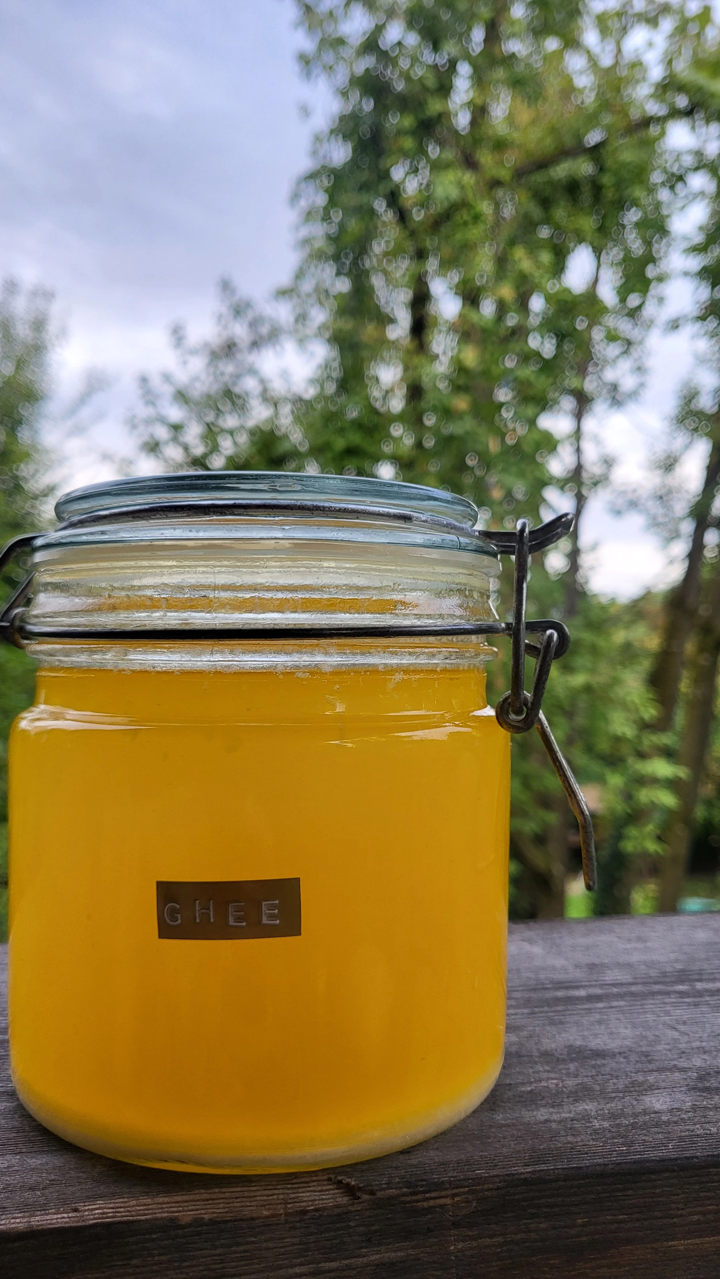 Ghee is a form of clarified butter, made by gently melting butter and separating the pure golden fat from the milk solids.